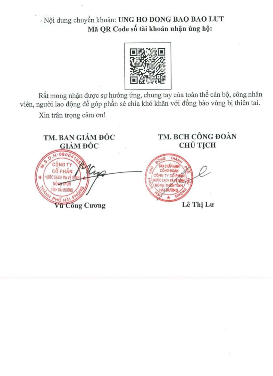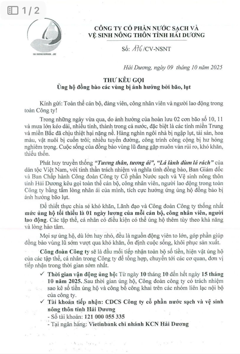 Trước tình hình nhiều địa phương tại miền Bắc và miền Trung đang phải gánh chịu những tổn thất nặng nề do ảnh hưởng của bão số 10 và 11, Công ty Cổ phần Nước sạch và Vệ sinh nông thôn tỉnh Hải Dương đã triển khai hoạt động ủng hộ, đóng góp nhằm hỗ trợ đồng bào vùng lũ. Theo đó, vào chiều ngày 09/10/2025, Ban Giám đốc cùng Ban Chấp hành Công đoàn Công ty đã ban hành Thư kêu gọi số 176/CV-NSNT. Văn bản này được gửi đến toàn thể cán bộ, đảng viên, công nhân viên và người lao động trong toàn Công ty, kêu gọi sự chung tay hỗ trợ từ các cá nhân và tập thể.