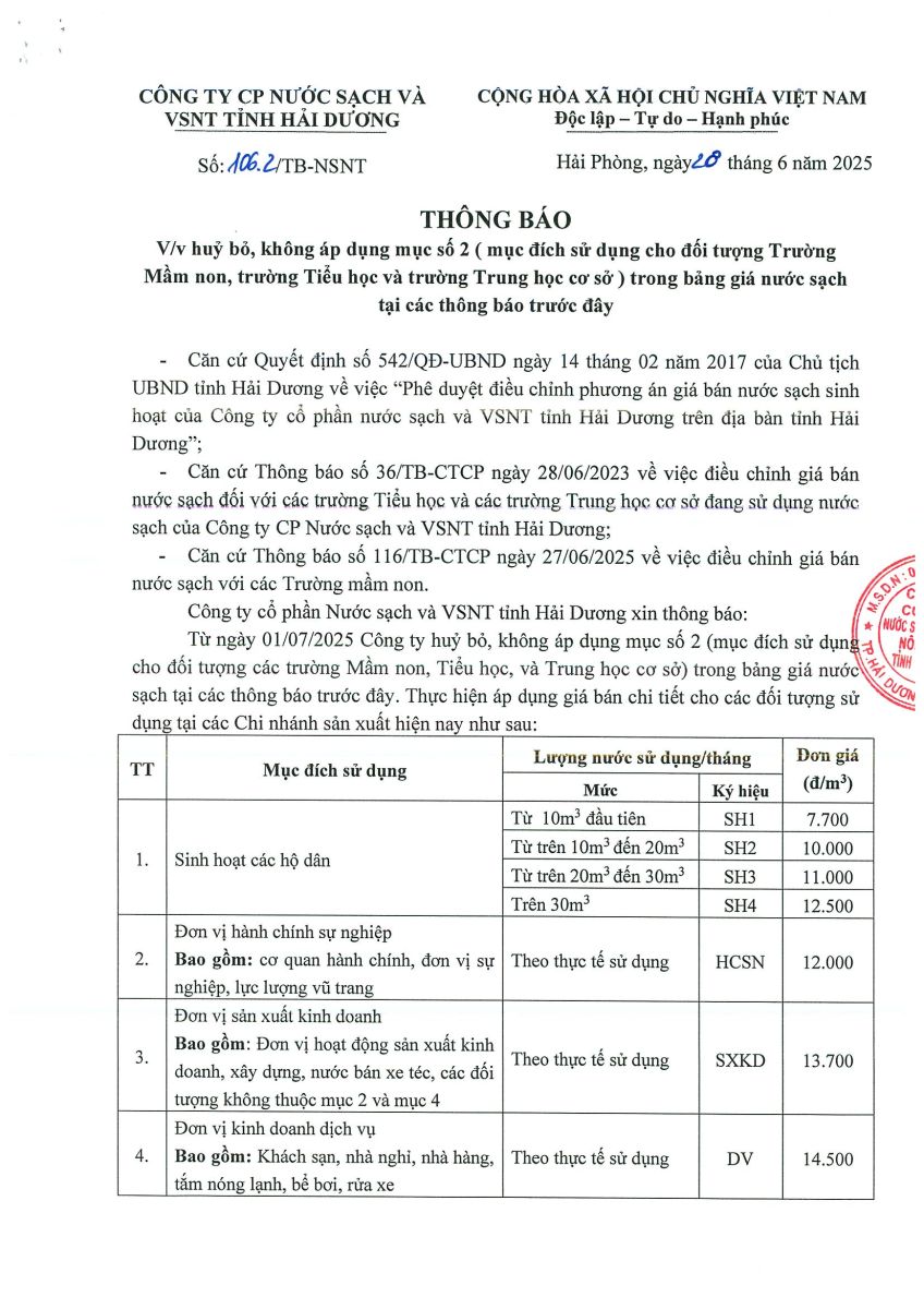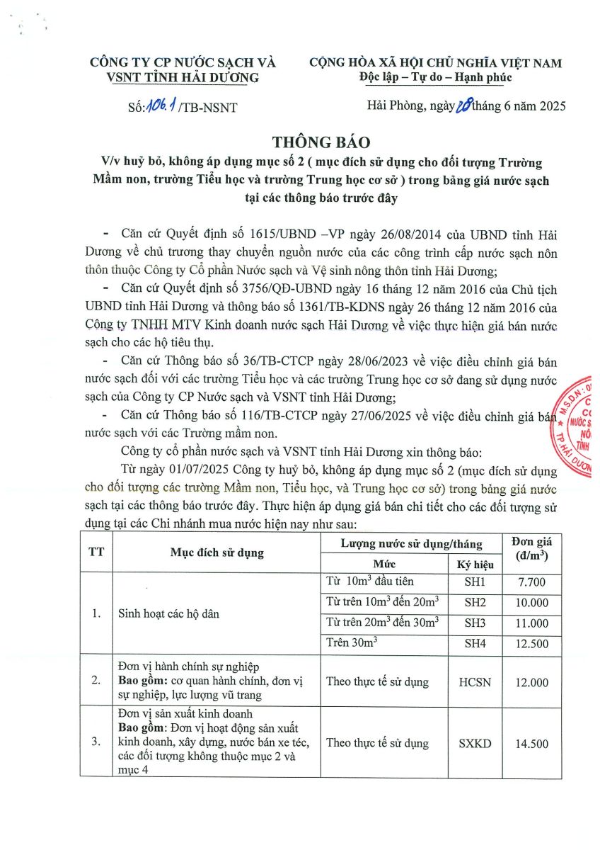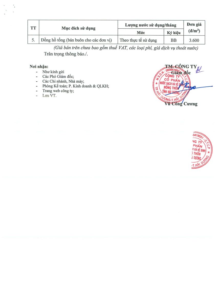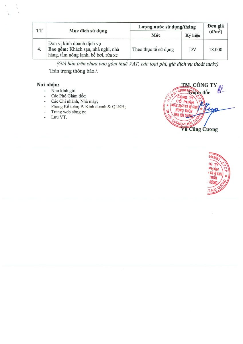 Thông báo giá nước Công ty cổ phần nước sạch và VSNT tỉnh Hải Dương